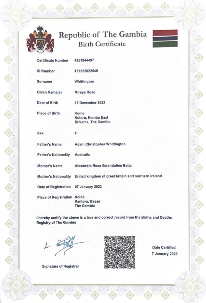 What is true though is that the birth certificate Mireya was issued was confirmed to be authentic by The Republic. Alexandra Rose Betts, the Director of Fundraising for the charity, was not in The Gambia when Mireya’s birth certificate was produced and she said she did not participate in its production. The charity’s Gambia director who appeared to have fallen out with Adam — Ebou Bass — said the document must have been obtained through fraudulent means.