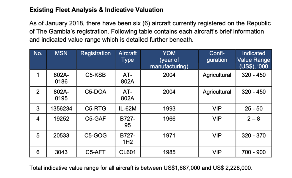 As of 2018, the total indicative value of the aircraft parked on the tarmac at the Banjul International Airport, according to a desktop valuation of US-based Viridis Aviation Partners, was $2.2m.