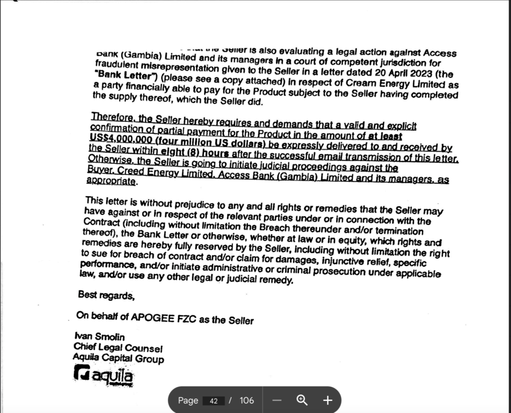 Aquila staff often also work for Apogee, which brought the Russian diesel to Banjul and sold it locally. A May 2023 email in the correspondence between its partner arranging the Zumba diesel cargo to Banjul, Ultimate Beige Logistics, copied in two Aquila employees, one of whom is also under US sanctions.