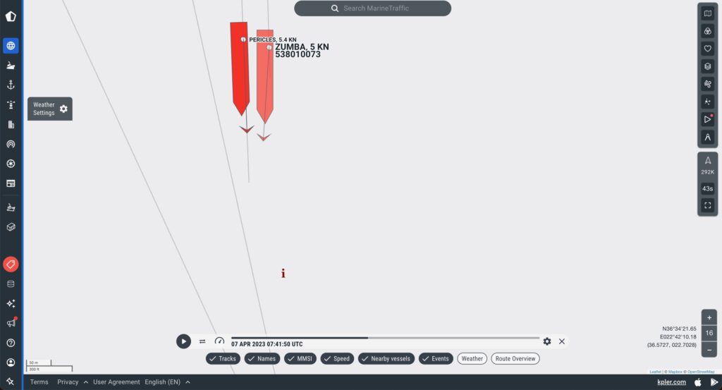 On 6 April, the Zumba arrived at the Laconia Gulf, off the coast of Greece, where it transferred the diesel to MT Pericles, the oil tanker that then brought it to the Gambia. The tracking data shows the ships lying motionless side-by-side for 34 hours, the only possible explanation for which is that they were transferring cargo from one to the other. Marine Traffic records this period as ‘STS’, or ship-to-ship transfer.