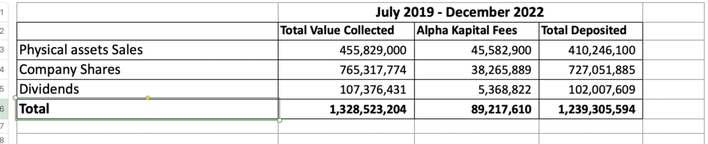 The original amount generated from the disposal of the shares and dividends received totals D765, 317, 774 ($12, 341, 381 as of December 2022) and D107,376,431 ($1, 731, 533 in December 2022) with Alpha’s 5% cut accumulating to D38, 265, 889 and D5,368,822.