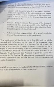Media reports have indicated that Barry was working with a former banker, Binta Sompo Ceesay — now the wife of former minister Tambadou, to dispose of the assets. The firm makes 10% on all assets sold and 5% on all shares liquidated, according to its agreement with the Ministry of Justice. The Janneh Commission had earlier protested a similar 10% fee being taken by court-appointed Augustus Prom, demanding a reduction to 3%.