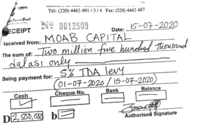 Binta paid the levy in July 2020, about a year after she got the provisional allocation from the Gambia Tourism Board. The parliamentary inquiry also found that she was issued a sub lease in ‘violation of land allocation procedures’. As the parliamentary investigation was ongoing, over a year after MOAB’s provisional allocation was made, the ministry of communication lay claim to the land she was allocated. The Gambia Tourism Board then suggested another plot in Tanji as compensation, something Binta turned down in 2022. MOAB’s allocation was cancelled in January 2023 and refunded the $50, 000 levy paid, according to the Gambia Tourism Board. Our questions to Binta were not replied to until the time of this [publication.